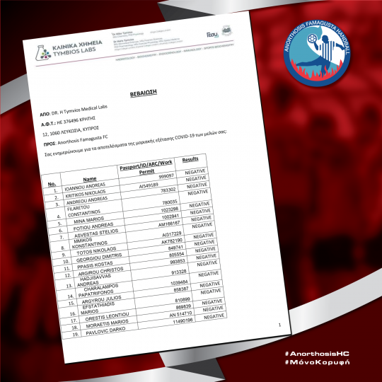 Η Sabbianco Ανόρθωσης Αμμοχώστου Χάντμπολ ενημερώνει πως μετά τις απαραίτητες ιατρικές εξετάσεις, στις οποίες υποβλήθηκαν όλα τα μέλη του τμήματος Χάντμπολ, οι παίκτες, το τεχνικό επιτελείο, τα διοικητικά στελέχη και το προσωπικό, τα τεστ βγήκαν όλα αρνητικά για τον ιό COVID-19.