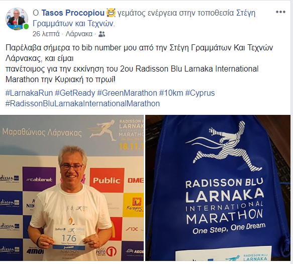Έτοιμος για τον 2ο μαραθώνιο Radisson Blu ο αντιπρόεδρος του ΚΟΑ Τάσος Προκοπίου, ο οποίος παρέλαβε τον αριθμό της συμμετοχής του και το μοιράστηκε με τους διαδυχτιακούς του φίλους,