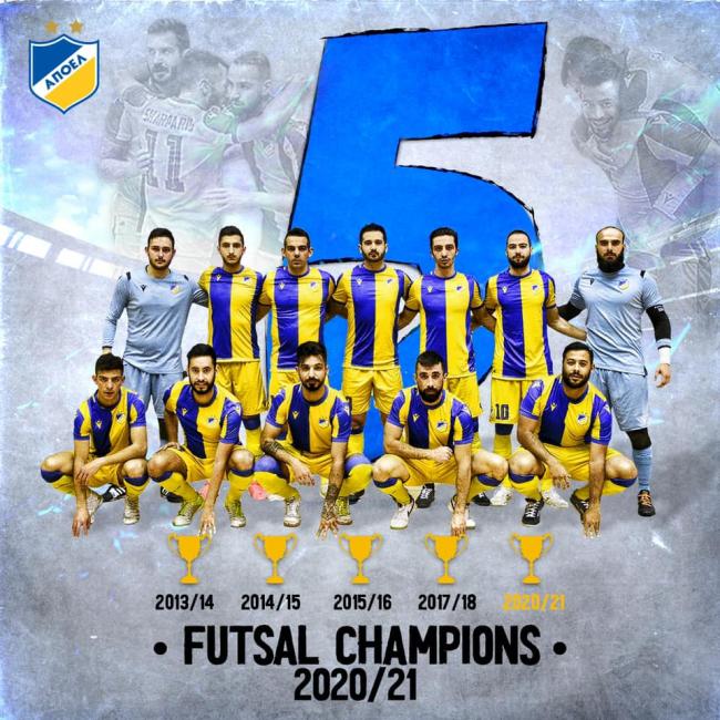 "Ο ΑΠΟΕΛ πανηγυρίζει απόψε τον 5ο τίτλο πρωταθλητή Futsal, στην ιστορία του. Κέρδισε την ΑΕΛ εκτός έδρας με 1-4, κατακτώντας μαθηματικά τον τίτλο. Συγχαρητήρια σε όλη την ομάδα. Σειρά παίρνει το κύπελλο", έγραψαν οι πρωτευουσιάνοι στα social media.