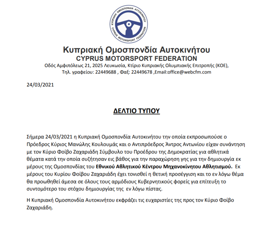 Δελτίο Τύπου από την Κυπριακή Ομοσπονδία Αυτοκινήτου για τη συνάντηση με τον Φοίβο Ζαχαριάδη, Σύμβουλο του Προέδρου της Δημοκρατίας.