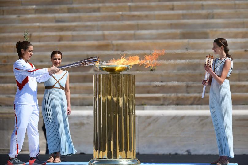 Η τελετή στο Παναθηναϊκό Στάδιο ξεκίνησε με την έπαρση της Ολυμπιακής, της Ιαπωνικής και της Ελληνικής Σημαίας, με την παράλληλη ανάκρουση του Ολυμπιακού Ύμνου και των δύο Εθνικών Ύμνων. Στη συνέχεια, η πρωθιέρεια Ξανθή Γεωργίου, μαζί με μία δεύτερη ιέρεια εισήλθαν στο στάδιο, περιμένοντας τους δύο τελευταίους λαμπαδηδρόμους. Τον χρυσό Ολυμπιονίκη του 2016 στους κρίκους Λευτέρη Πετρούνια και την χρυσή Ολυμπιονίκη στο άλμα επί κοντώ Κατερίνα Στεφανίδη, με την τελευταία να ανάβει το βωμό στο στάδιο.