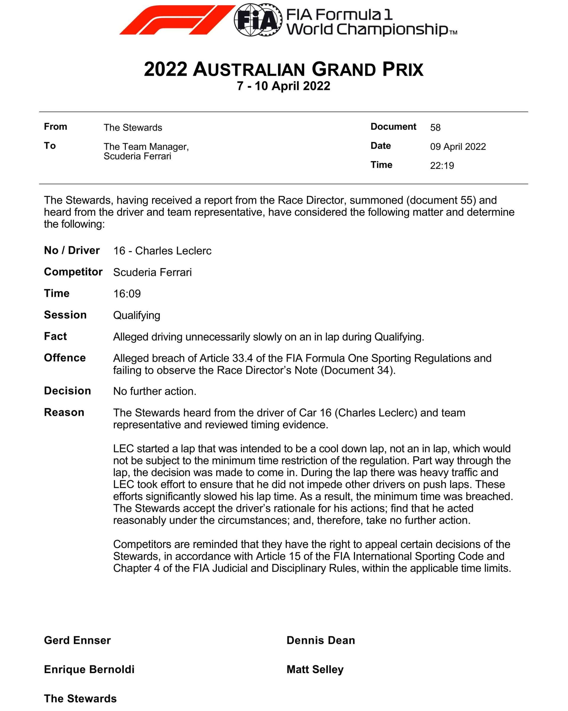 Λήξη συναγερμού στο στρατόπεδο της Scuderia Ferrari, αφού οι αγωνοδίκες του Grand Prix Αυστραλίας που αποτελεί τον τρίτο γύρο του φετινού παγκοσμίου πρωταθλήματος της Formula 1, αποφάσισαν να μην αναλάβουν δράση σχετικά με τον Σαρλ Λεκλέρ.