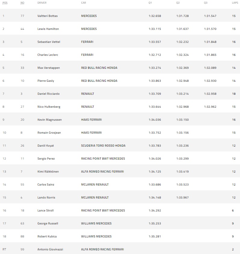 Στο τέλος του Q3 ο Χάμιλτον έκανε τον τελευταίο γρήγορο γύρο του όμως δεν κατάφερε να περάσει το χρόνο που είχε ορίσει ο Μπότας νωρίτερα. Ο ίδιος ο Μπότας όμως, ξεπέρασε τον εαυτό του και βελτίωσε κι άλλο, για να είναι σίγουρος ότι κανείς δεν θα του «κλέψει» την πρωτιά! Στη συνέχεια συναντάμε τις δύο Ferrari που έκαναν πολύ καλές προσπάθειες, αλλά δεν ξεπέρασαν τις δύο Mercedes. Φέτελ και Λεκλέρκ έπιασαν την τρίτη και την τέταρτη θέση αντίστοιχα, ενώ πιο πίσω, Φερστάπεν και Γκασλί συνεχίζουν στην κατάταξη. Με τη σημερινή pole position του Μπότας επιβεβαιώνονται και οι... στοιχηματικές ικανότητες του Νίκο Ρόσμπεργκ, ο οποίος έλεγε ότι θα πόνταρε τα λεφτά του στην πρώτη θέση του πιλότου της Mercedes σήμερα. Δείτε αναλυτικά τα αποτελέσματα των δοκιμών: