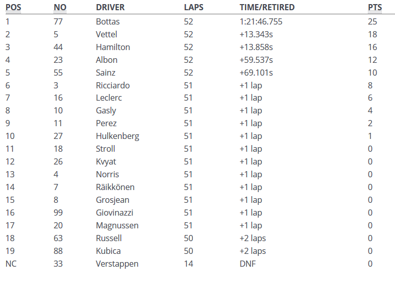 Μεγάλος ωφελημένος από το συγκεκριμένο άρθρο του κανονισμού ήταν ο Σέρτζιο Πέρεζ της Racing Point, ο οποίος συγκρούστηκε στον 53ο γύρο με τον Πιερ Γκασλί της Toro Rosso και χτύπησε πάνω στα πλαϊνά προστατευτικά της πίστας, όμως βαθμολογήθηκε τελικά ένατος και έλαβε δύο βαθμούς. Αντίθετα, ο άτυχος της ημέρας ήταν ο Λανς Στρολ που τερμάτισε μετά από 53 γύρους δέκατος, όμως τελικά έμεινε εκτός δεκάδας και βαθμών ως ενδέκατος! Πάντως, οι αγωνοδίκες θα εξετάσουν τη σύγκρουση μεταξύ Πέρεζ και Γκασλί και θα επιβάλλουν ποινές, εφόσον κρίνουν αναγκαίο, αν και το συμβάν έγινε στον 53ο γύρο, που δεν μέτρησε στον αγώνα!