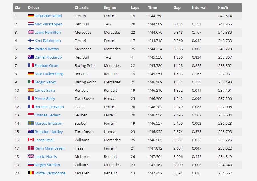 Στην έκτη θέση του FP1 συναντάμε τον Ντάνιελ Ρικιάρντο, με τους Οκόν και Χούλκεμπεργκ να βρίσκονται στην έβδομη και όγδοη θέση αντίστοιχα. Την πρώτη δεκάδα συμπληρώνουν ο Σέρχιο Πέρεζ στην ένατη θέση και ο Κάρλος Σάινθ στην δέκατη. Δείτε αναλυτικά τα αποτελέσματα του FP1 στο Σπα: