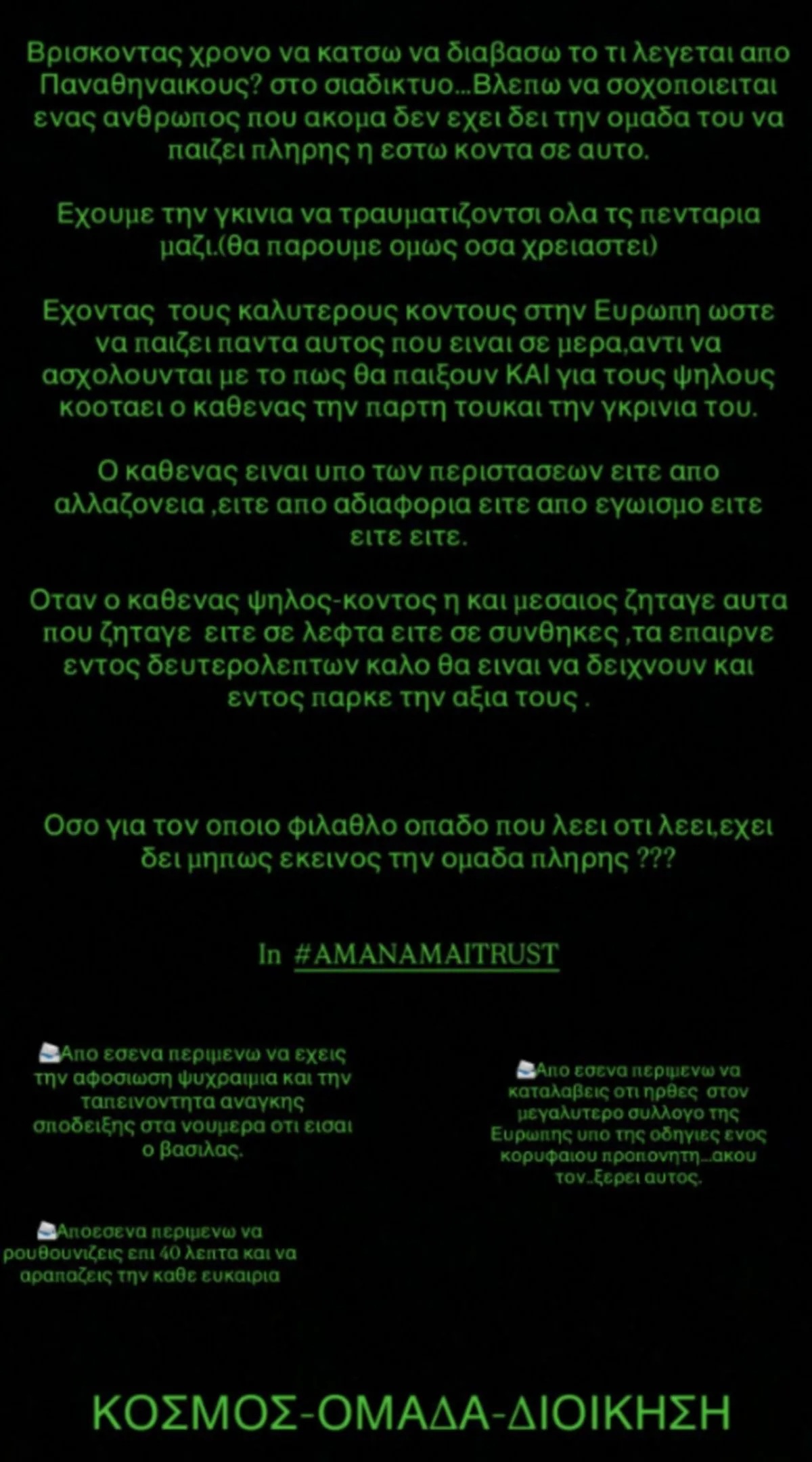 «Bρίσκοντας χρόνο να διαβάσω το τι λέγεται από Παναθηναϊκούς στο διαδίκτυο… Βλέπω να στοχοποιείται ένας άνθρωπος που ακόμα δεν έχει δει την ομάδα του να παίζει πλήρης ή έστω κοντά σε αυτό. Έχουμε την γκίνια να τραυματίζονται όλα τα πεντάρια (θα πάρουμε όμως όσα χρειαστεί).