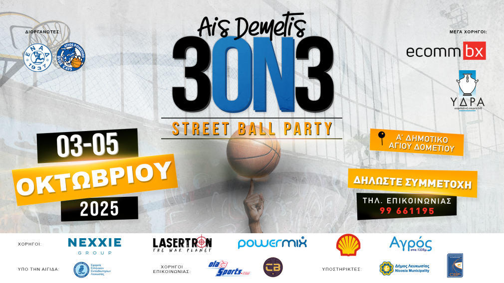 Ξεκινάει το απόγευμα της Παρασκευής (03/10) και ολοκληρώνεται την Κυριακή (05/10) το 1ο Ais Demetis 3on3 Street Basketball Party, το οποίο διοργανώνουν η ιστορική ΕΝΑΔ Αγίου Δομετίου και οι Blue Cats, στο χώρο του Α’ Δημοτικού Αγίου Δομετίου.