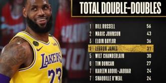 Ο Λεμπρόν Τζέιμς με το 31ο του «double double» ξεπέρασε τον θρυλικό Τσάμπερλειν(pic) 01.10.2020 | 08:49 Ο Λεμπρόν Τζέιμς με το 31ο του «double double» ξεπέρασε τον θρυλικό Τσάμπερλειν(pic)