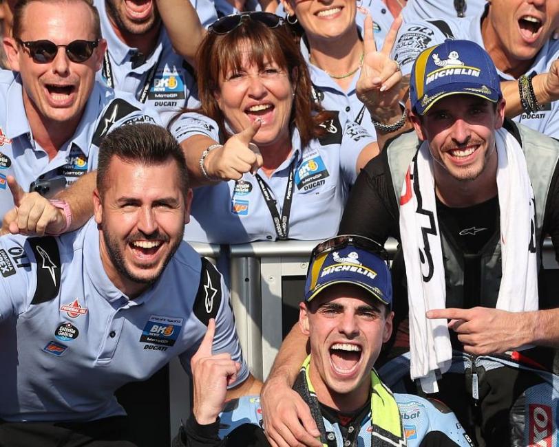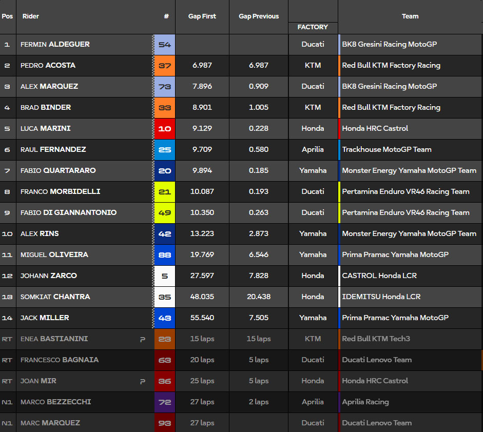 Αφού πάλεψε για μερικούς γύρους με τον Πέδρο Ακόστα (KTM), ο Φερμίν Αλντεγκέρ, μόλις 20 ετών- ο οποίος τερμάτισε χθες (4/10)δεύτερος στο σπριντ-, έφυγε, ανοίγοντας γρήγορα μια διαφορά σχεδόν εννέα δευτερολέπτων καθώς μια έντονη μάχη για τη δεύτερη θέση γινόταν πίσω του.