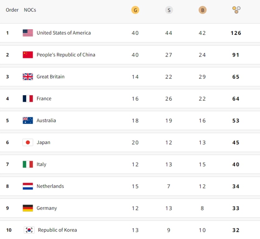 Για μία ακόμη φορά, οι Ηνωμένες Πολιτείες κυριάρχησαν κατά κράτος στα συνολικά μετάλλια, έχοντας 126, με την Κίνα να ακολουθεί στη δεύτερη θέση με 91, κάτι που αποδεικνύει την αισθητή διαφορά της Team USA σε σχέση με τους ανταγωνιστές της!