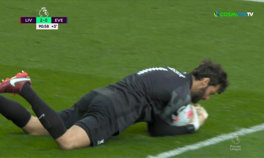 Ήταν η στιγμή που ο Βραζιλιάνος κίπερ μπλόκαρε σταθερά τη μπάλα σε σουτ του Ρισάρλισον στο 91', με τον Άλισον να πέφτει επίτηδες στο έδαφος, μιμούμενος τον Άγγλο κίπερ των ζαχαρωτών, για να γνωρίσει την αποθέωση από τους οπαδούς της Λίβερπουλ για την εμπνευσμένη κίνησή του.