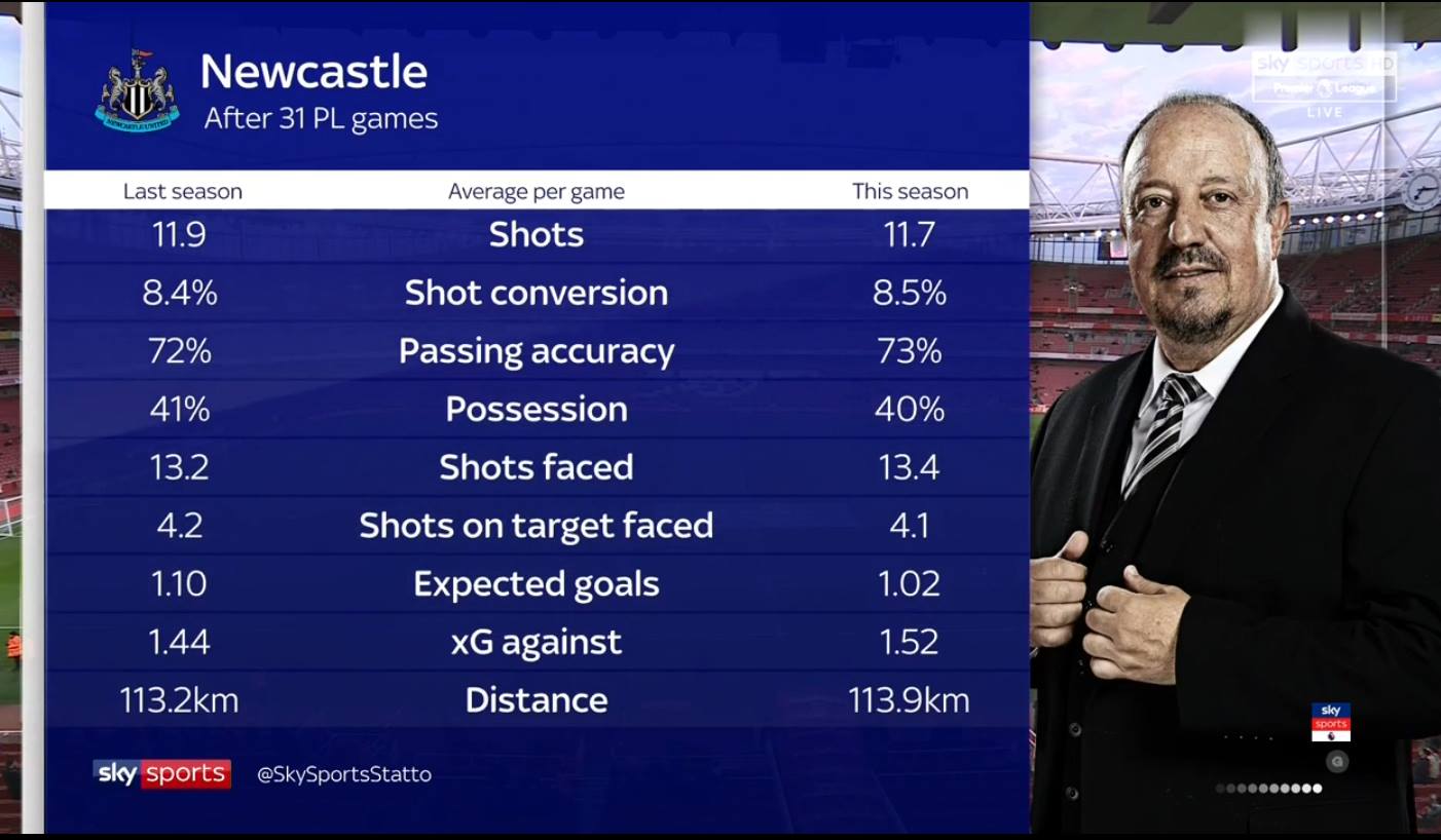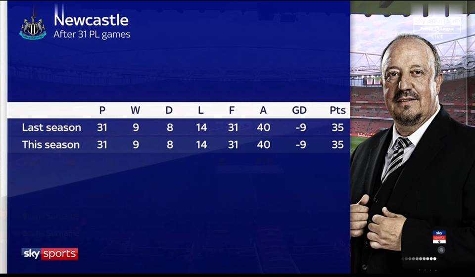 Η Νιουκάστλ Γιουνάιτεντ είχε μετά από 31 αγωνιστικές της φετινής Πρέμιερ Λιγκ, ακριβώς τα ίδια νούμερα σε όλες τις κατηγορίες της βαθμολογίας, με αυτά που είχε και την περασμένη σεζόν στην 31η αγωνιστική!