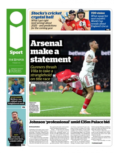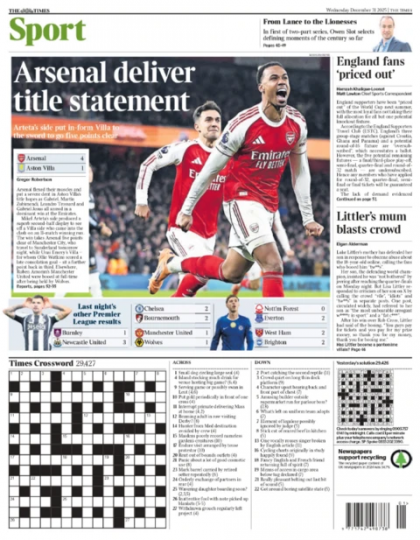 Αυτό ακριβώς επισημαίνουν και όλα τα αγγλικά Πρωτοσέλιδα, τα οποία αποθεώνουν το σύνολο του Μικέλ Αρτέτα! Κάνουν λόγο για απαντήσεις σε κάθε… δύσπιστο, για μεγάλη εμφάνιση και για νίκη… τίτλου, με άπαντες να αντιλαμβάνονται πως ίσως το 2026 να είναι η σεζόν της Άρσεναλ.