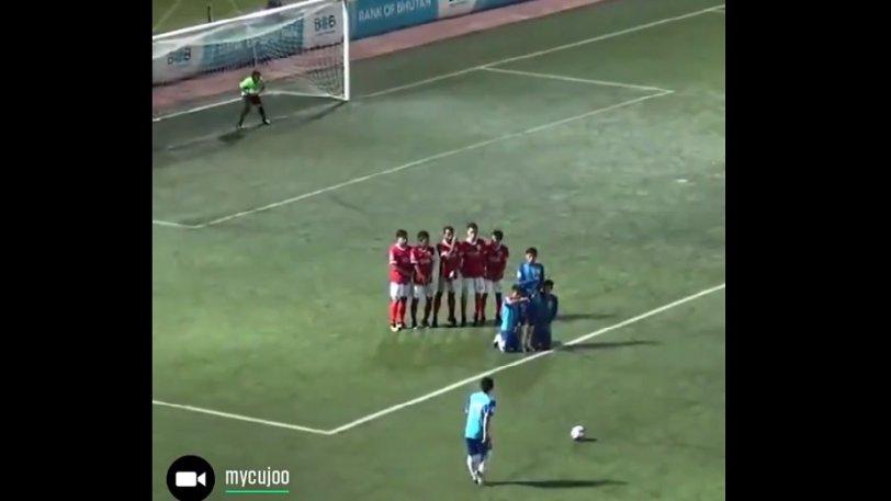 Κάνοντας ένα τείχος με τρεις παίκτες ακριβώς μπροστά από αυτό της ομάδας που έπρεπε ν' αμυνθεί στη στημένη φάση, με δυο παιδιά στα γόνατα κι ένα όρθιο ανάμεσά τους, η εκτέλεση του φάουλ κατέληξε στα δίχτυα παρουσιάζοντας μια αρκετά περίεργη και πρωτότυπη στιγμή...