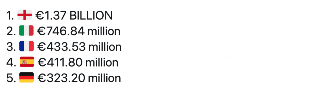 Η Premier League πήρε για ακόμα μια χρονιά αυτό τον άτυπο τίτλο με τα 20 club της κορυφαίας κατηγορίας να δίνουν συνολικά 1.37 δισ. ευρώ για να ακολουθήσει σε μια μίνι-έκπληξη η Ιταλία που με Γιουβέντους και Ιντερ να είναι δυνατές, ανέβασαν το ποσό στα 747. Πολύ πιο κάτω έπαιξαν μπάλα οι επόμενες τρεις λίγκες, με την Ligue1 να βάζει 433, την La Liga 411 και την Bundesliga να κλείνει στα 323. Μάλιστα, τα δύο τελευταία πρωταθλήματα, Το ισπανικό [82] και το γερμανικό [1.7], ήταν τα μοναδικά που έγραψαν κέρδος στο πάρε-δώσε.
