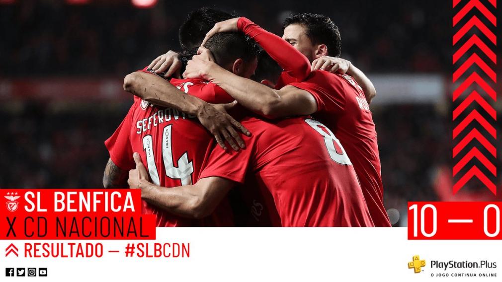 Σκορ «μαμούθ» πέτυχε η Μπενφίκα, διασύροντας με 10-0 τη Νασιονάλ για την 21η αγωνιστική του πορτογαλικού πρωταθλήματος. Με τον Οδυσσέα Βλαχοδήμο και τον Ανδρέα Σάμαρη στη βασική ενδεκάδα (ο διεθνής μέσος αντικαταστάθηκε στο 62΄), οι «αετοί» δεν λυπήθηκαν τους φιλοξενούμενους και έφτασαν σε μία από τις ευρύτερες νίκες στην ιστορία τους. Παράλληλα, αξιοποίησαν την ισοπαλία της Πόρτο με την Μορεϊρένσε την Παρασκευή (8/2) και πλησίασαν στον ένα βαθμό την κορυφή.