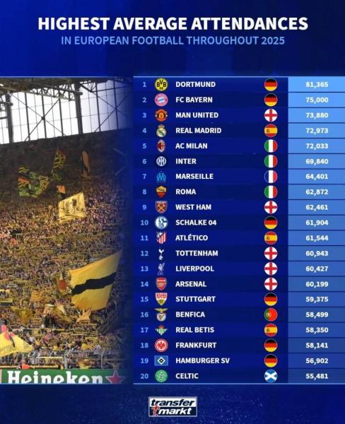 Οι γερμανικές ομάδες κατάφεραν να συγκεντρώσουν τους περισσότερους φιλάθλους στο γήπεδο, αφού Ντόρτμουντ και Μπάγερν Μονάχου προπορεύονται στην λίστα. Μάντσεστερ Γιουνάιτεντ, Ρεάλ Μαδρίτης και Μίλαν κλείνουν την πρώτη πεντάδα.