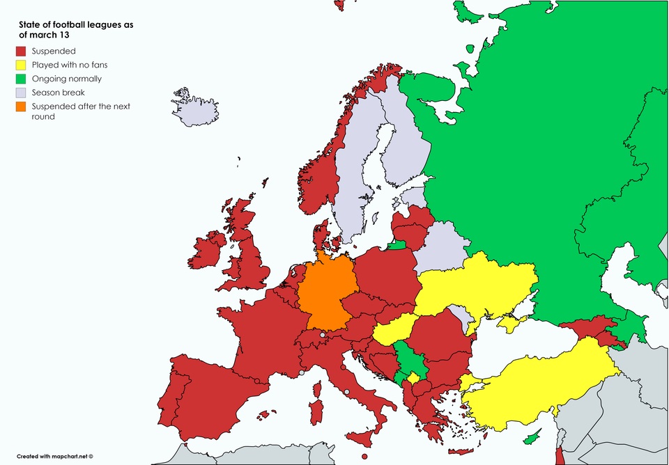 Στον παρακάτω χάρτη μπορεί να δείτε σε ποιες ευρωπαϊκές χώρες παίζεται ποδόσφαιρο, είτε με κόσμο είτε κεκλεισμένων των θυρών. Φυσικά, μπορείτε να δείτε τις χώρες στις οποίες έχουν αναβληθεί οι ποδοσφαιρικές δραστηριότητες λόγω του κορωνοϊού αλλά και σε ποιες δεν έχουν ξεκινήσει ακόμη τα πρωταθλήματα.