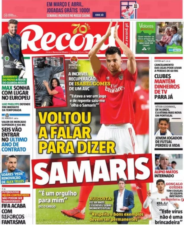 Η πορτογαλική εφημερίδα Record κυκλοφόρησε τη Δευτέρα 30 Μαρτίου με τον Ανδρέα Σάμαρη στο εξώφυλλό της. Η αφορμή δεν δόθηκε από κάποια 'μυστική' πληροφορία για το μέλλον του στην Μπενφίκα. Όπως σε αρκετές περιπτώσεις στο παρελθόν, παρά το συμβόλαιο που τον δεσμεύει ως το καλοκαίρι του 2023, αφού ούτως ή άλλως η διοίκηση φροντίζει να (μοσχο)πουλάει τ' αστέρια της.