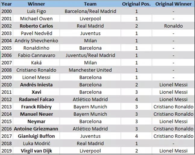 Ιδού ο σχετικός πίνακας με τους παίκτες που έχουν πάρει την Χρυσή Μπάλα, με εκείνους που θα ήθελε το sportbible να την πάρουν και με την κανονική θέση που πήραν τότε οι παίκτες: