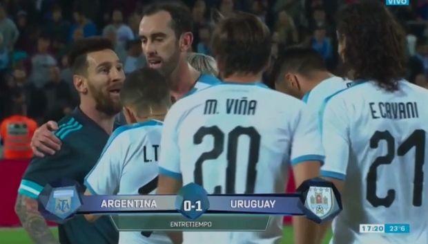 Ο τηλεοπτικός φακός "συνέλαβε" τον Έντινσον Καβάνι να προκαλεί σε... ξύλο τον Λιονέλ Μέσι κατά τη διάρκεια του φιλικού Αργεντινή - Ουρουγουάη, με τον σούπερ σταρ της Μπαρτσελόνα να αποδέχεται την πρόταση.