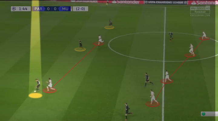 Θα δούμε πιο κάτω σε διαδοχικές εικόνες το σημείο όπου πήρε την μπάλα ο αμυντικός από τον συμπαίκτη του ενώ έχει την πλάτη γυρισμένη στον Rashford που έρχεται να τον πιέσει (Εικόνα 1). Στην συνέχεια τον βλέπουμε να κρατά μπάλα κοιτάζοντας κάτω χωρίς να έχει αντίληψη του χώρου και των άλλων παικτών γύρω του (Εικόνα 2). Στο τέλος βλέπουμε την πίσω πάσα που δίνει ο αμυντικός στα τυφλά στο κέντρο μπροστά από τον τερματοφύλακα (Εικόνα 3) όπου έρχεται πρώτος ο Lukaku και κλέβει την μπάλα και σκοράρει.