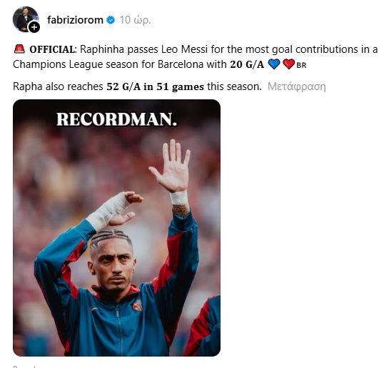 Όπως έγραψε ο Φαμπρίτσιο Ρομάνο στο Threads, ο Βραζιλιάνος μεσοεπιθετικός έφτασε τις 20 συμμετοχές σε γκολ (γκολ και ασίστ) στο φετινό Champions League, ξεπερνώντας ακόμα και τον θρυλικό Λιονέλ Μέσι, ο οποίος κρατούσε το σχετικό ρεκόρ με τα χρώματα της Μπαρτσελόνα.
