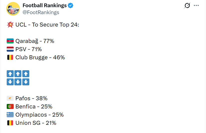 Σύμφωνα με τις ιστοσελίδες στατιστικών Football Meets Data και Football Rankings οι πιθανότητες πρόκρισης για την ομάδα του Χουάν Κάρλος Καρθέδο μειώθηκαν κατά 38%, ποσοστό που υστερεί μόνον έναντι των αντιστοίχων των Καραμπάχ (77%), Αϊντχόφεν (71%) και Μπρούγκε (48%).