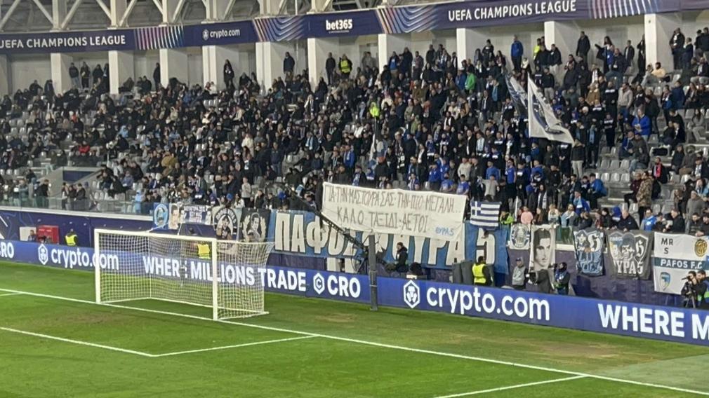 «Για τη μαστούρα σας την πιο μεγάλη, καλό ταξίδι αετοί», αναγράφεται στο πανό των φίλων της Πάφου και της θύρα 5.