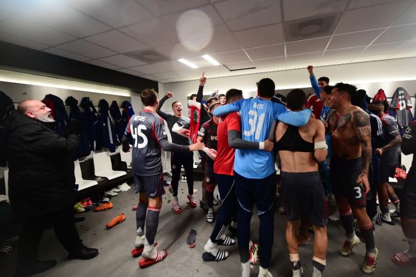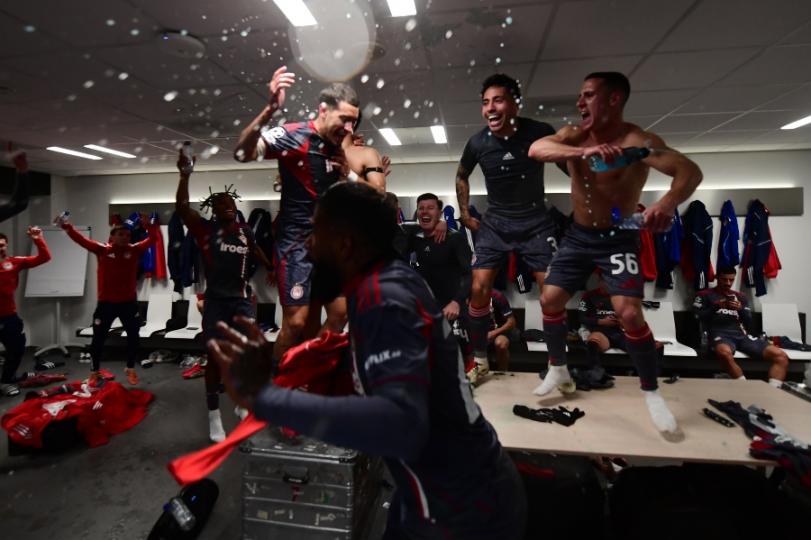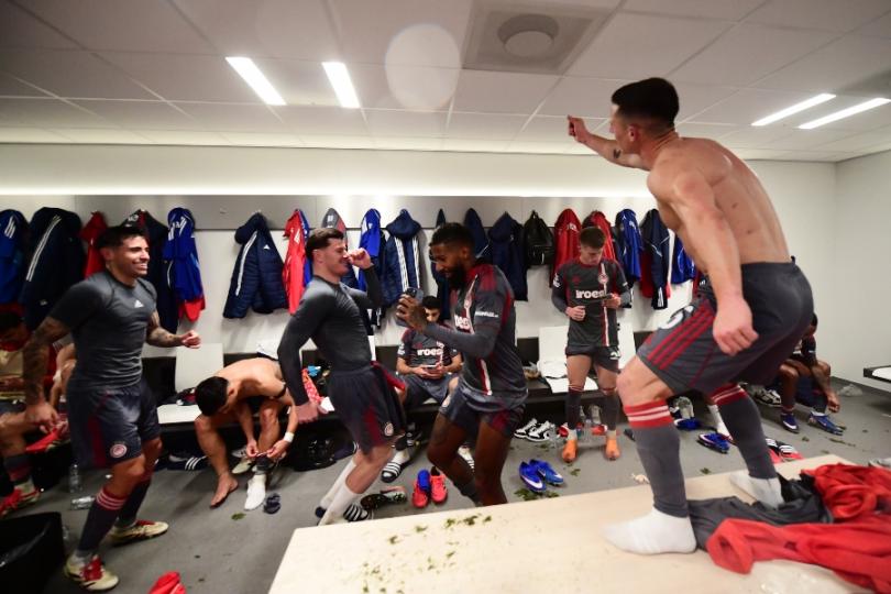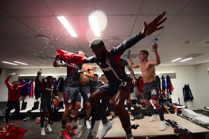 Μετά το τέλος του αγώνα, οι «ερυθρόλευκοι» πανηγύρισαν με την ψυχή τους - παρέα με τον Μπάμπη Κωστούλα - την σπουδαία αυτή πρόκριση στα playoffs της διοργάνωσης, τραγουδώντας, χορεύοντας και παίζοντας μπουγέλο υπό τους ήχους του «Freed From Desire»!