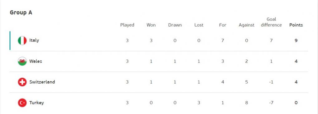 Την πρώτη θέση στον Α΄ όμιλο πήρε η Ιταλία μαζί με την πρόκριση στην επόμενη φάση του Euro 2020, μετά την νίκη της κόντρα στην Ουαλία με σκορ 1-0 . Από την άλλη πλευρά, παρά την ήττα, οι Ουαλοί πήραν τη δεύτερη θέση, που οδηγεί επίσης απευθείας στην επόμενη φάση.