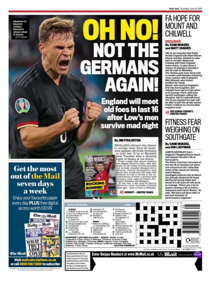 Η μεγάλη κόντρα Αγγλίας και Γερμανίας, αλλά πολύ περισσότερο ο πόνος που έχουν προκαλέσει «πάντσερ» στους Βρετανούς, έκανε την Daily Mail να κυκλοφορήσει με τρομερό τίτλο το πρωί της Πέμπτης!