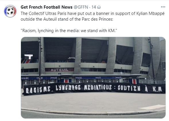 Ωστόσο οι φίλοι της Παρί Σεν Ζερμέν θέλησαν από την πλευρά τους, να στηρίξουν τον 22χρονο επιθετικό. Για τον λόγο αυτό κρέμασαν έξω από το «Παρκ ντε Πρενς», ένα πανό που έγραφε:«Ρατσισμός, λιντσάρισμα στα μέσα ενημέρωσης: Είμαστε μαζί σου Κιλιάν Μπαπέ».