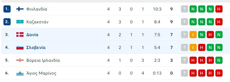 Στο άλλο παιχνίδι το Καζακστάν με γκολ του Αϊμπέτοφ στο 88 έφυγαν με «διπλό» από το Μπέλφαστ και έπιασε την Φινλανδία στην κορυφή.