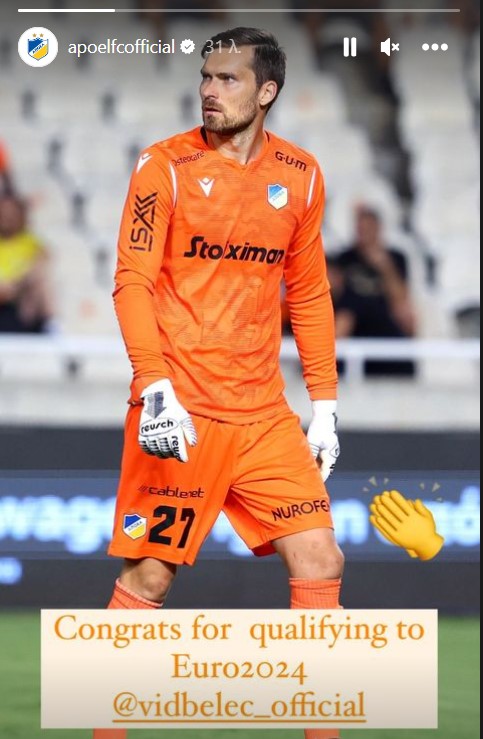 Η Εθνική Σλοβενίας με τη χθεσινή της νίκη απέναντι στο Καζακστάν με 2-1, εξασφάλισε την πρόκριση στην τελική φάση του Euro 2024 και ο ΑΠΟΕΛ με ανάρτηση του συνεχάρη τον τερματοφύλακά του, Μπέλετς.