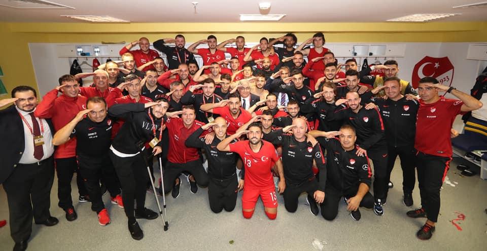 Δεν έφτανε αυτό που μετά το γκολ πανηγύρισαν στρατιωτικά, έδωσαν και συνέχεια αφού ολόκληρη η αποστολή πόζαρε και χαιρέτησε στρατιωτικά.