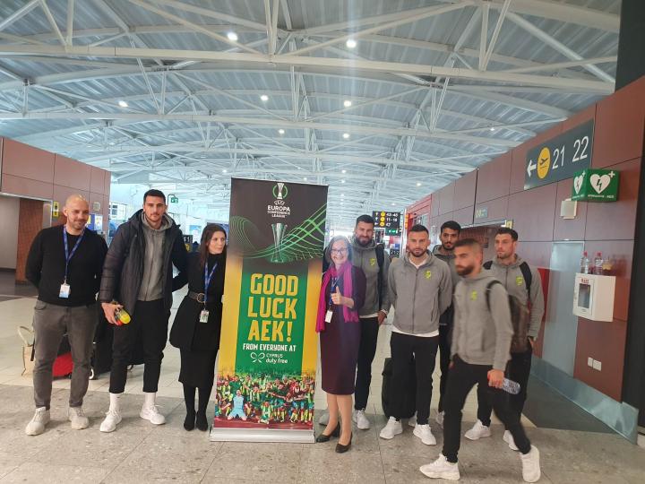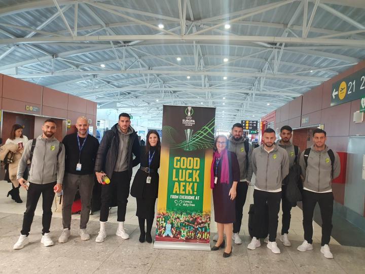 Ιβάν Τρισκόφσκι, Μιλίσεβιτς, Τόμοβιτς, Εγγλέζου, Τούμπας και Χριστοφόρου πόζαραν με το πανό για καλή επιτυχία στην ΑΕΚ και γνώρισαν την αποθέωση από τους παρευρισκόμενους.