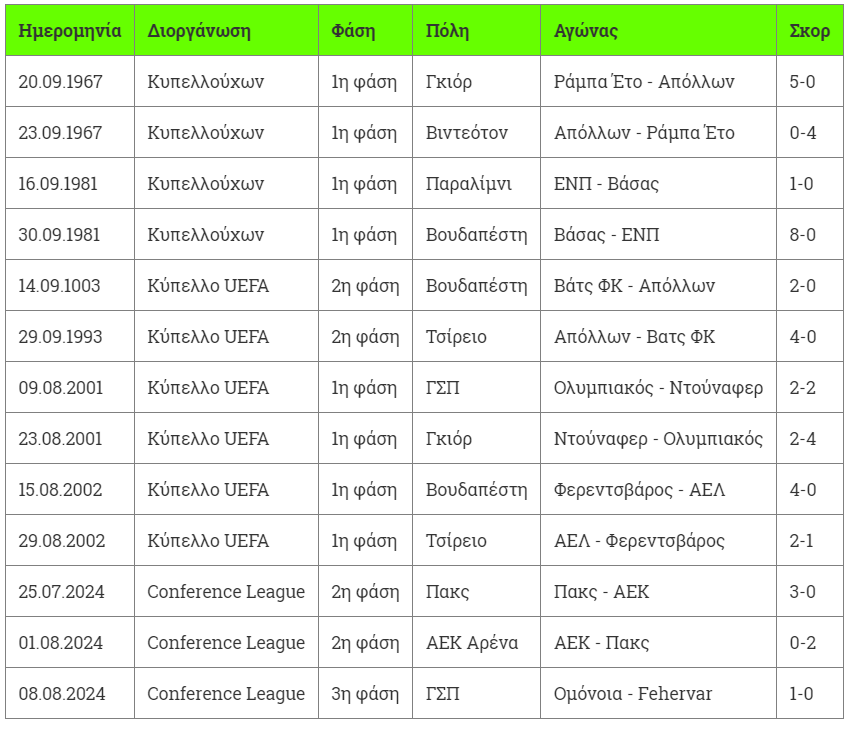 Μέχρι τώρα, αντιμέτωποι με ομάδες της Ουγγαρίας αναλυτικά βρέθηκαν ο Απόλλωνας (2 φορές με 1 πρόκριση) και από 1 φορά η ΕΝ Παραλιμνίου, ο Ολυμπιακός (προκρίθηκε), η ΑΕΛ, η ΑΕΚ και χθες η Ομόνοια που πέτυχε την 5η μας νίκη.