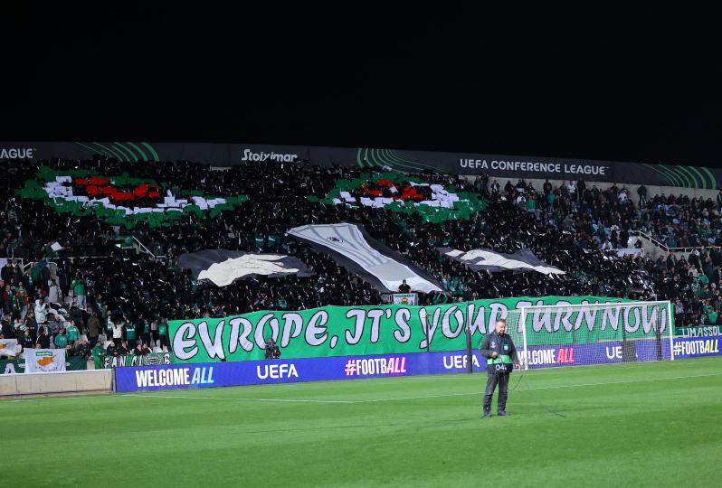 Στο κέντρο της κερκίδας δέσποζε πανό με το μήνυμα «Europe, it's your turn now», ένα σύνθημα που αποτύπωσε με αυθεντικό τρόπο την προσμονή του κόσμου για τη νέα ευρωπαϊκή υπέρβαση της ομάδας. Καθώς η ενδεκάδα της Ομόνοιας έκανε την εμφάνισή της στον αγωνιστικό χώρο, ο παλμός της κερκίδας ανέβηκε στα... πράσινα με φανταστική ατμόσφαιρα.