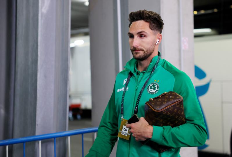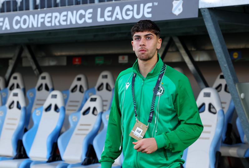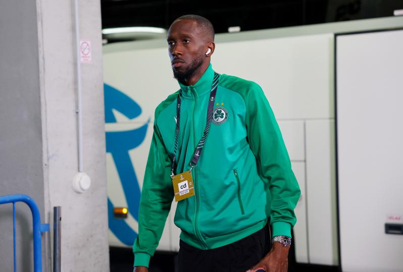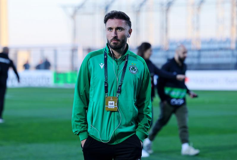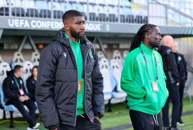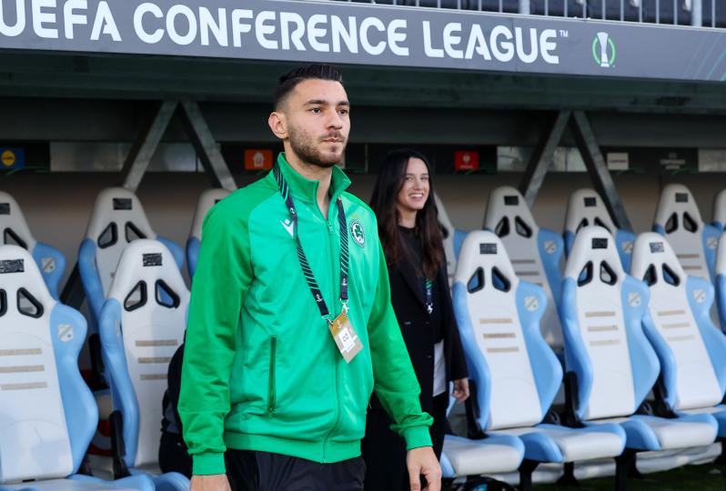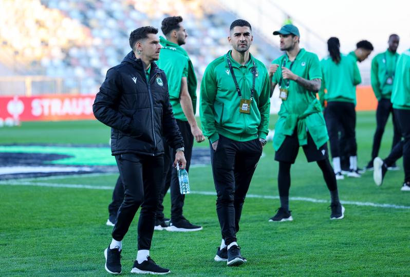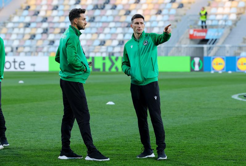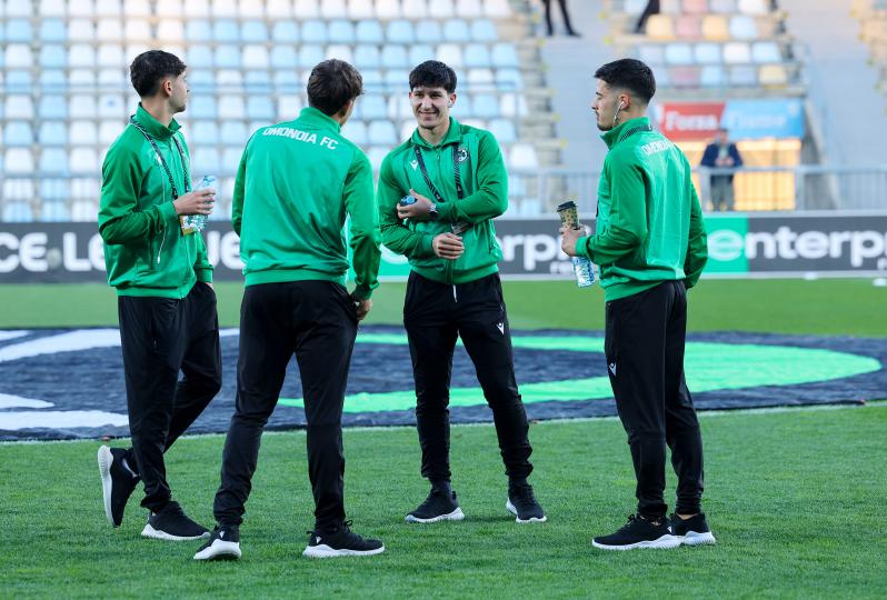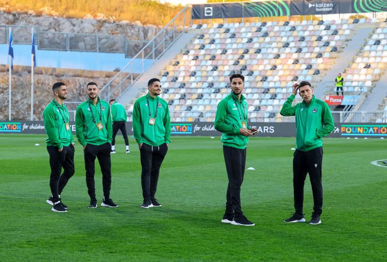 Πηγαδάκια ανάμεσα στους ποδοσφαιριστές της Ομόνοιας στον αγωνιστικό χώρο του σταδίου Rujevica, πριν από τον επαναληπτικό αγώνα με τη Ριέκα για την ενδιάμεση φάση του Conference League. Οι «πράσινοι» θα ψάξουν την ανατροπή στην έδρα των Κροατών.