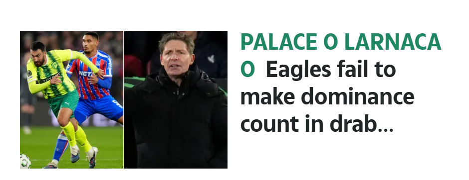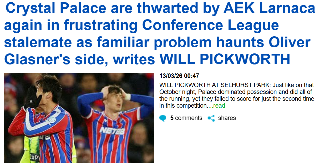 Η Κρίσταλ Πάλας αποτυγχάνει ξανά απέναντι στην ΑΕΚ (Daily Mail)