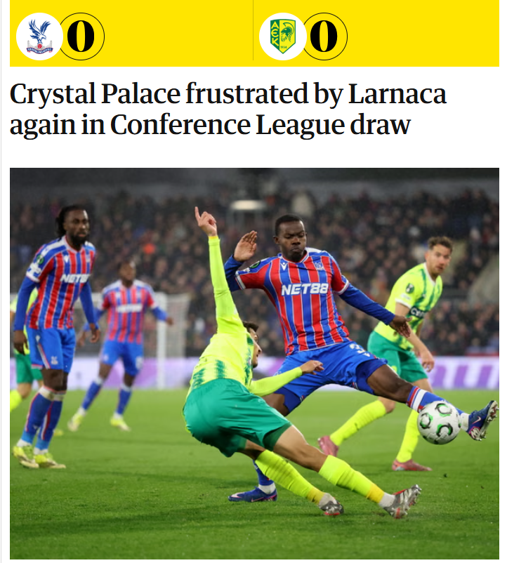 Το 0-0 αφήνει ακέραιες τις πιθανότητες πρόκρισης των Λαρνακέων εν όψει της αναμέτρησης στην Αρένα την ερχόμενη Πέμπτη (19.3). καθώς δείχνει να έχει βρει τον τρόπο να φέρνει βόλτα τους «αετούς», όπως παραδέχονται και τα αγγλικά ΜΜΕ.