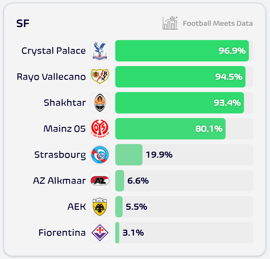 Επιπλέον, η ομάδα του Μάρκο Νίκολιτς μετά το χθεσινό αποτέλεσμα έχει πιθανότητες 2,1% για να βρεθεί στον τελικό και 0,8%, για να κατακτήσει το τρόπαιο στον τελικό της Λειψίας. Πρώτο φαβορί για τον τίτλο δίνεται η Κρίσταλ Πάλας με 48,1%, ακολουθεί η Μάιντς με 21%, ενώ τρίτη είναι η Ράγιο Βαγεκάνο με 16,9%. Λιγότερες πιθανότητες από την ΑΕΚ έχει μόνο η Άλκμααρ (0,4%).
