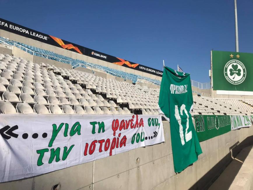 Η Ομόνοια απόψε θα δώσει ένα πολύ σημαντικό παιχνίδι απέναντι στην PSV στο ΓΣΠ (22:00), για την 2η αγωνιστική του Γιουρόπα Λιγκ. Ο κόσμος δεν έχει τη δυνατότητα να δώσει το παρών του στο στάδιο της πρωτεύουσας, όμως η βόρεια κερκίδα έχει ήδη ντυθεί στα 'πράσινα', με γιγαντιαία φανέλα του 12ου παίκτη και διαφόρων συνθημάτων. Δείτε τις φωτογραφίες που ανήρτησε πριν από λίγο η Ομόνοια στα social media από το στολισμένο ΓΣΠ.