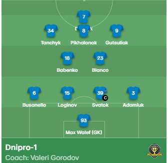 Η Ντνίπρο θα αρχίσει με τους πιο κάτω 11 παίκτες την αναμέτρηση στην ''Αρένα'' απέναντι στην ΑΕΚ για τον επαναληπτικό στα πλαίσια των μπαράζ του Γιουρόπα Λιγκ.
