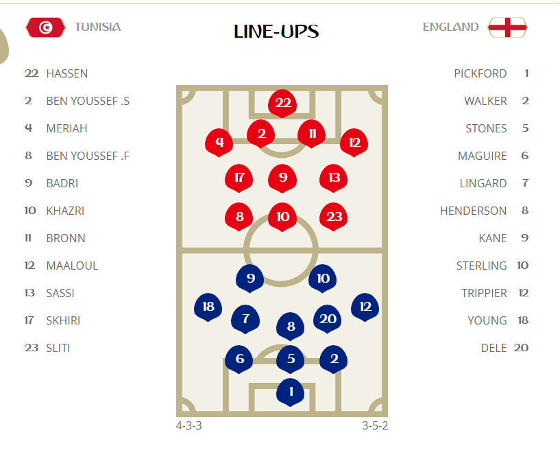 Αγγλία (3-5-2): Πίκφορντ - Γουόκερ, Στόουνς, Μαγκουάιρ - Τρίπιερ, Ντέλε Άλι, Χέντερσον, Λίνγκαρντ, Γιανγκ - Στέρλινγκ, Κέιν