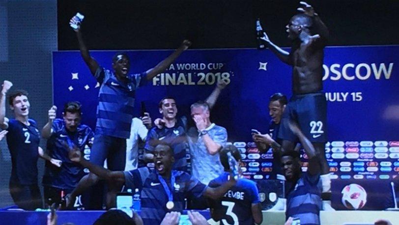 Απίθανο σκηνικό στη συνέντευξη τύπου που προσπάθησε να δώσει ο Ντιντιέ Ντεσάν, καθώς οι παίκτες του δεν τον άφησαν ποτέ να το κάνει. Μπήκαν μέσα, ανέβηκαν πάνω στο τραπέζι, τον μπουγέλωσαν, χοροπηδούσαν και τραγουδούσαν, κάνοντας χαμό. Το φοβερό είναι ότι ενώ ο προπονητής τους κατάφερε να τους βγάλει από την αίθουσα, εκείνοι ξαναμπήκαν μέσα και τα έκαναν ακόμα πιο σμπαράλια.