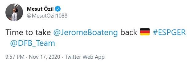 «Ήλθε η ώρα να κληθεί ξανά ο Τζερόμ Μπόατενγκ» έγραψε ο Οζίλ στα μέσα κοινωνικής δικτύωσης.