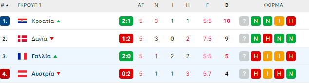 Από την άλλη η Κροατία συνεχίζει στην πρώτη θέση του Γκρουπ 1, επικρατώντας 1-0 της Δανίας, η οποία ακολουθεί στη 2η με 9 βαθμούς. Οι Κροάτες ψάχνουν ίδιο ή καλύτερο αποτέλεσμα από τη σημερινή τους αντίπαλο την τελευταία αγωνιστική για να πάρουν την πρωτιά του ομίλου!