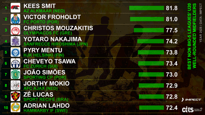 Ακόμα μία σημαντική διάκριση για Έλληνες ποδοσφαιριστές, με το Διεθνές Κεντρικό Αθλητικών Σπουδών (CIES) να ανακοινώνει τους κορυφαίους ποδοσφαιριστές κάτω των 20 ετών, που δεν αγωνίζονται στα πέντε κορυφαία πρωταθλήματα της Ευρώπης.